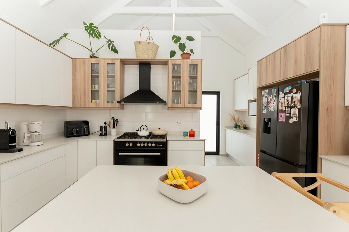 The open-plan kitchen is stylish and practical, fitted with a centre island, space for a double-door fridge, and a separate scullery. The living area flows seamlessly from the kitchen and includes a built-in braai, with sliding doors opening onto a paved patio and a grassy garden — ideal for children or pets.