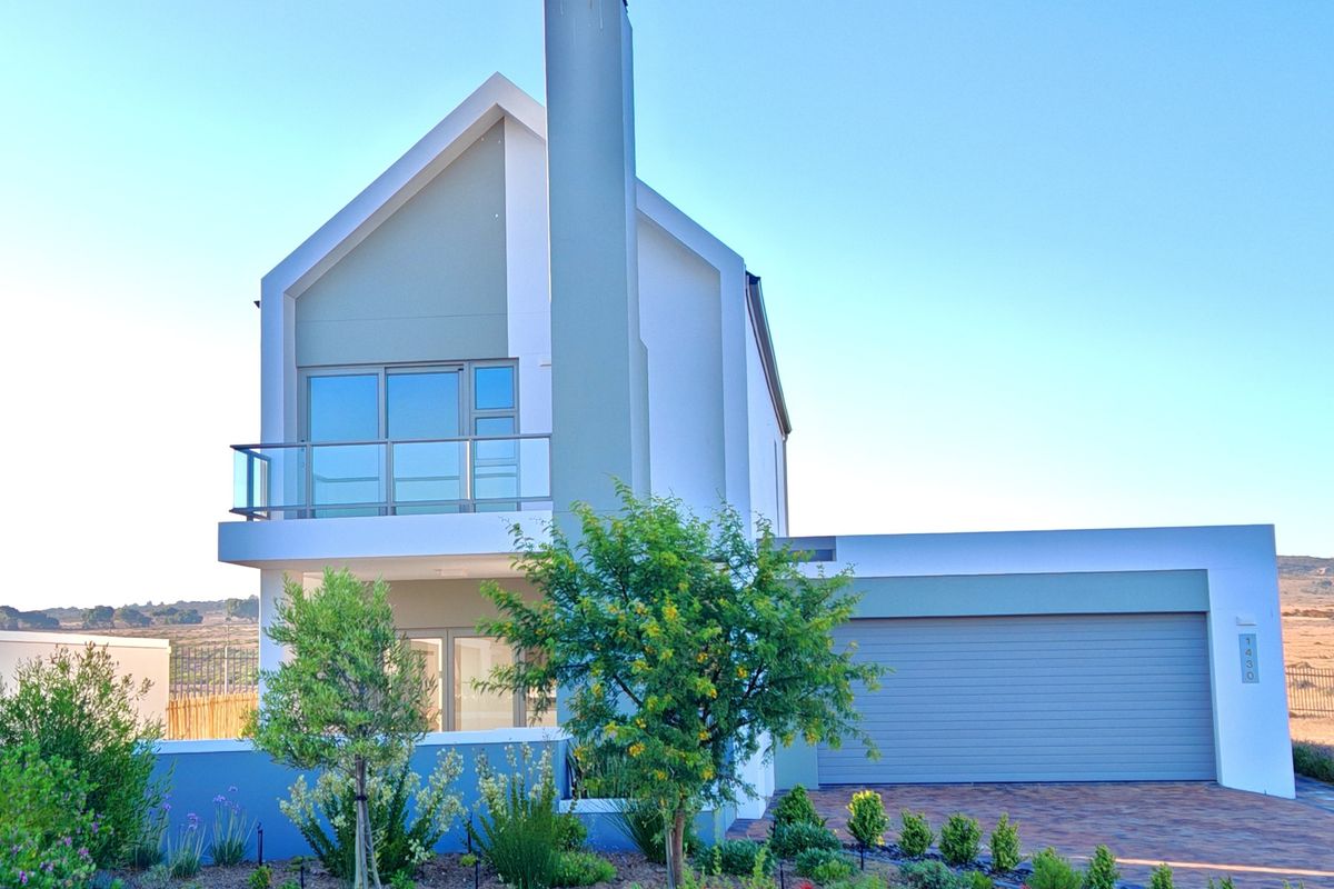 Resort-style living in Langebaan Country Estate with golf, trails and clubhouse access; brand-new double-storey home featuring a balcony with lagoon views and covered patio.