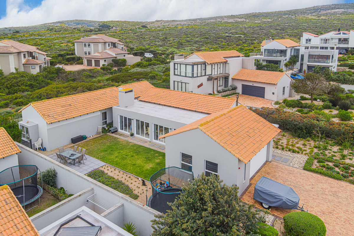 Embrace relaxed Langebaan estate living with clubhouse and golf, indoor-outdoor flow, private garden; industrial-style exposed steel beams, double-volume ceilings, fireplace. Three bedrooms, 3.5 bathrooms, double garage.