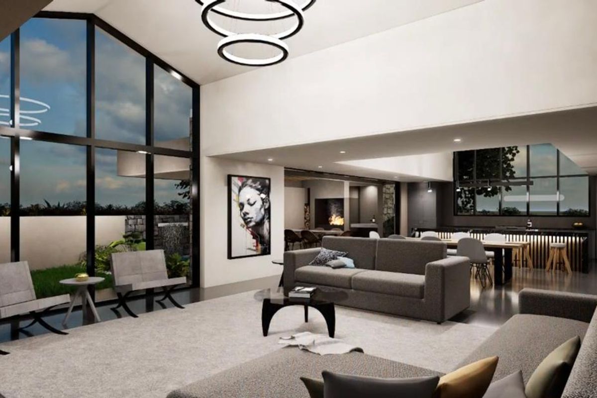 The open-plan kitchen, dining, and living area creates a spacious and comfortable environment. The kitchen includes a central island, gas stove connection, and a concealed scullery. Large sliding doors open to the outdoor areas, allowing easy indoor-outdoor living.