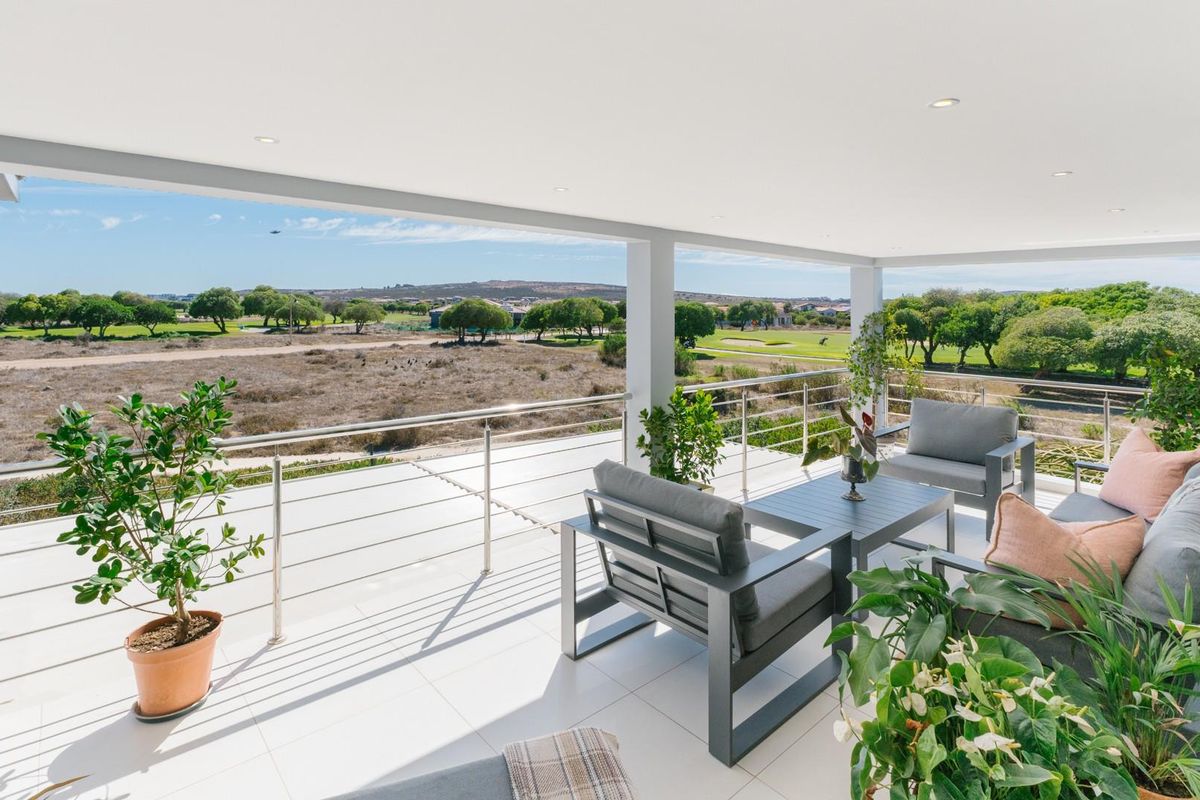 Golf-course lifestyle on Langebaan Country Estate's 12th fairway with north-facing fairway views, private lift, and seamless indoor-outdoor flow — four en-suite bedrooms, 2.5-car garage.
