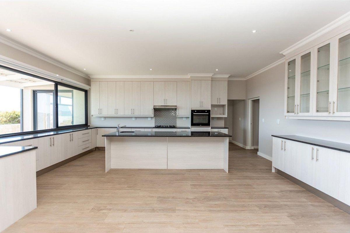 The home offers a generous open-plan kitchen and living area, designed with high ceilings and large windows to maximise natural light. The kitchen is both stylish and functional, fitted with gas hobs, an eye-level electric oven, a large walk-in pantry, and a separate scullery. Sliding doors open onto a north-facing covered patio with partial lagoon views, ideal for relaxed indoor-outdoor living.