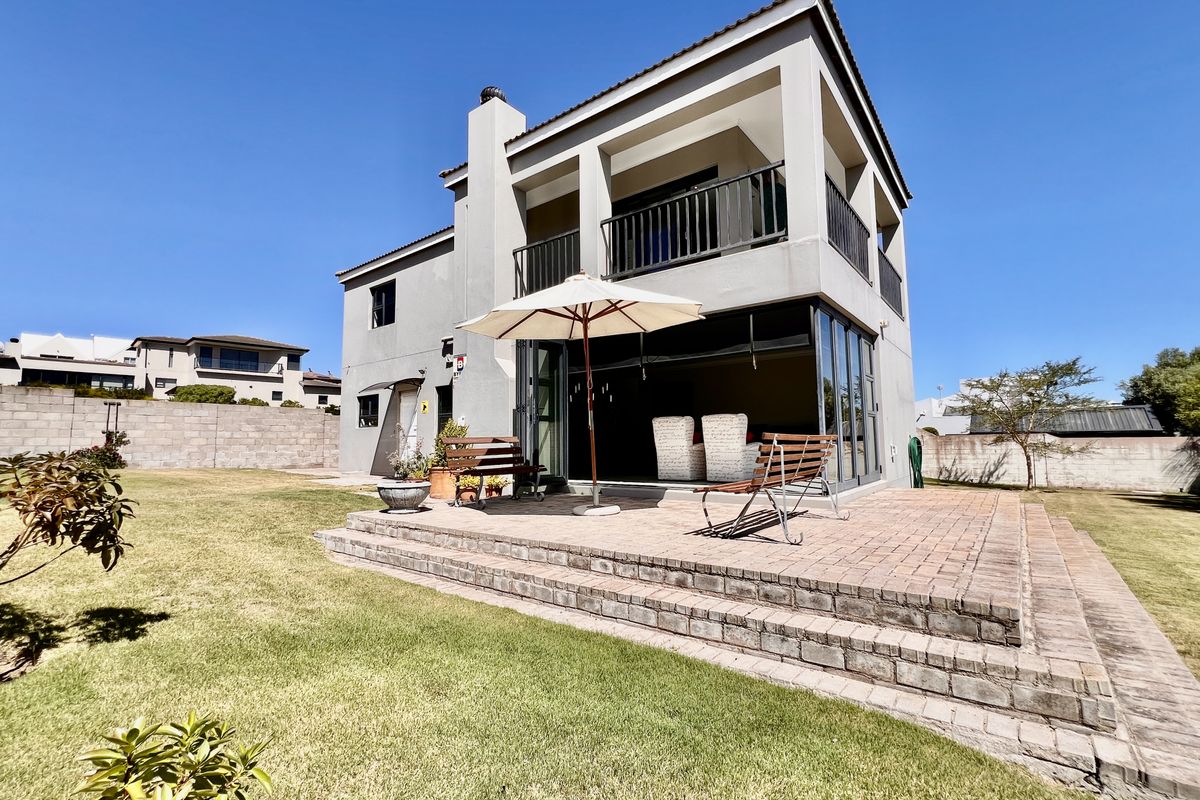 Embrace relaxed coastal living in Langebaan, tucked behind a greenbelt with second-floor lagoon views. Private walled garden, indoor braai and patio — three bedrooms, three bathrooms, double garage.