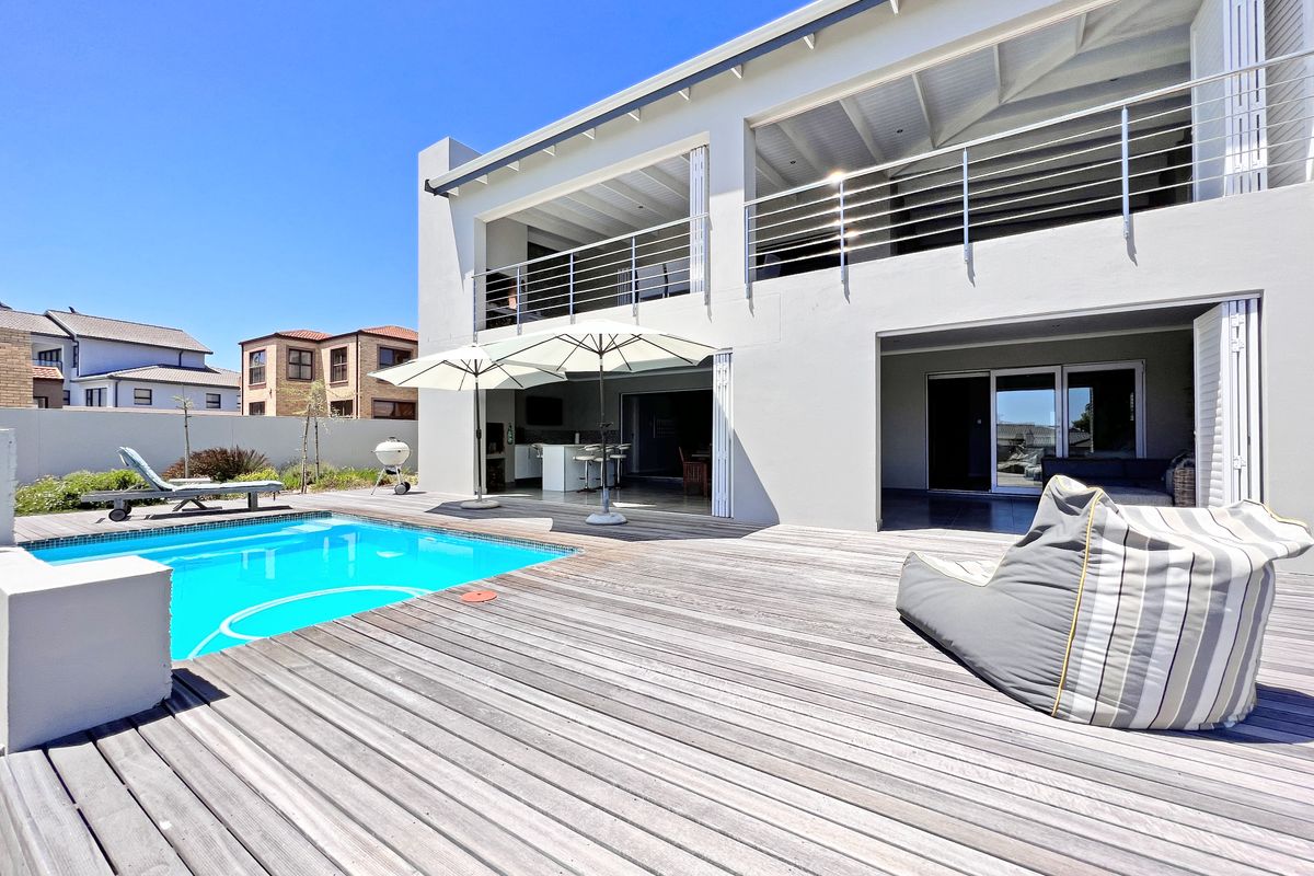 Embrace lagoon-side living near the yacht club in Myburgh Park, with a pool, expansive garden, entertainment patio with outdoor kitchen, four en-suite bedrooms and four garages.