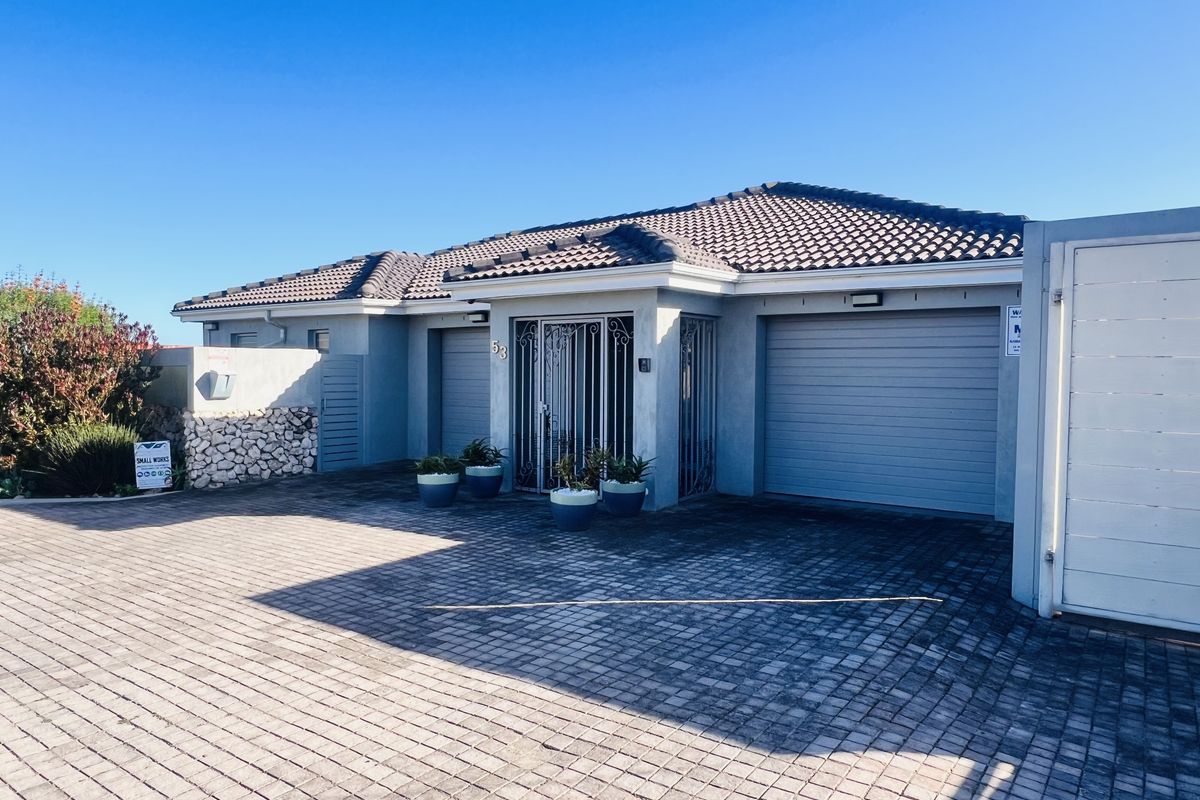 Relaxed family beachside living near Shark Bay and Langebaan — garden with sparkling pool and indoor braai, solid wood countertops, five bedrooms, 3.5 baths and two garages.