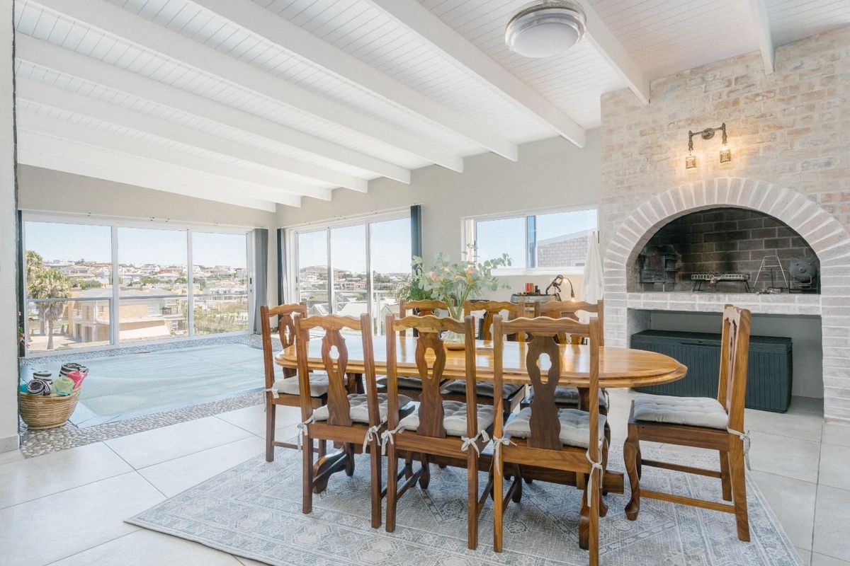At the heart of the home is a cleverly designed open-plan living area, incorporating the dining room, lounge (which can be separated if desired), a stylish built-in bar, and seamless flow to the indoor swimming pool—creating an ideal space for both relaxed living and entertaining. The modern kitchen is beautifully appointed with a large separate scullery and pantry, complemented by a built-in braai for effortless hosting.