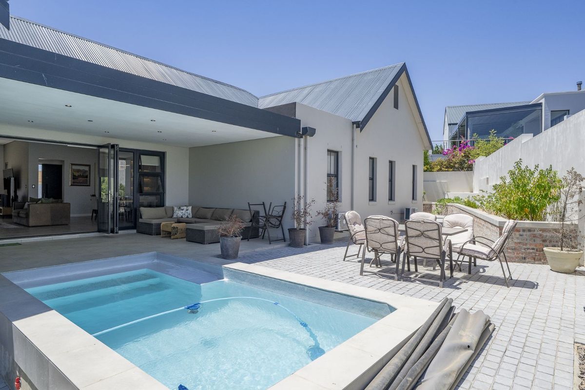 Perfect for entertaining, the home offers an extra-deep built-in braai area with cupboards for glassware and space for a fridge, opening via sliding doors onto a large patio overlooking the swimming pool. The paved outdoor area with planter boxes provides space to add an additional outside braai, all surrounded by a low-maintenance garden