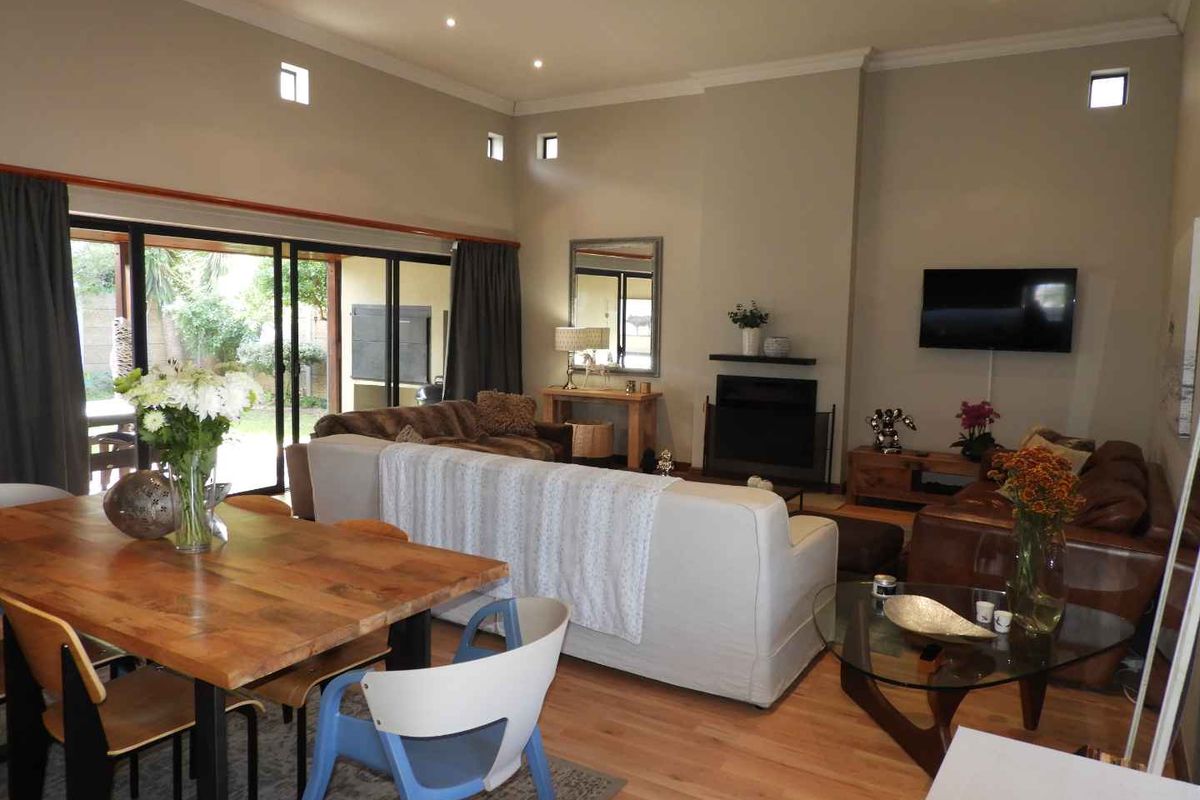 The lounge area is a true highlight, featuring a cozy wood-burning fireplace — perfect for those cooler evenings. This space effortlessly opens up to the back garden, where you can enjoy the covered patio and braai area, ideal for outdoor gatherings and relaxation.