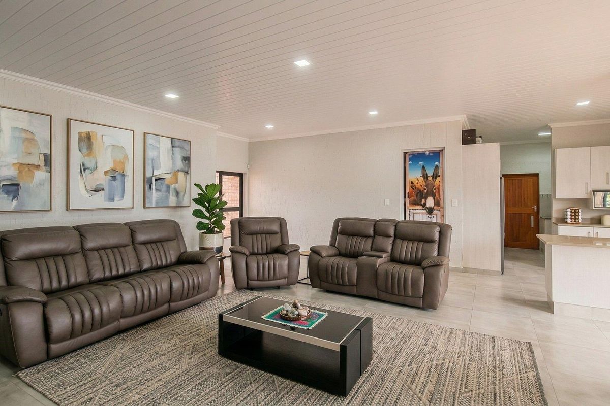The home features an open-plan living and dining area with built-in braai, that flows naturally into a modern kitchen.