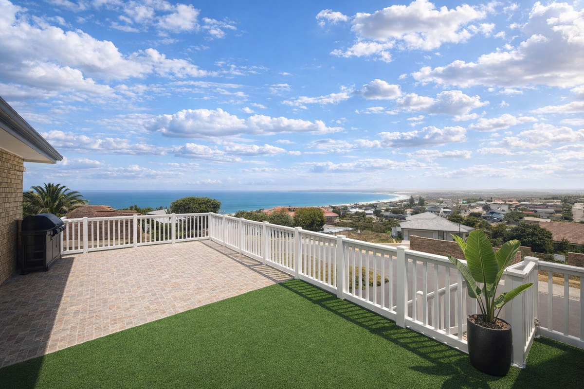 Seaside retreat for multigenerational living and effortless entertaining, with panoramic ocean views from sunlit balconies, dual-living layout featuring indoor and balcony braais, four beds, four baths and three garages.