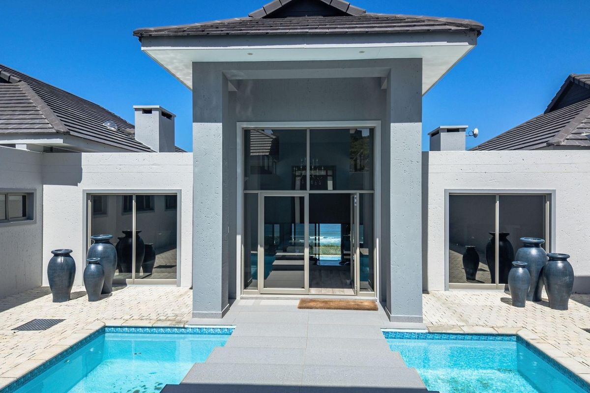 Entertainer's coastal sanctuary in Moquini Coastal Estate on the Garden Route, with dramatic bridge entrance over dual pools and sweeping ocean vistas; four beds, 4.5 baths and double garage.