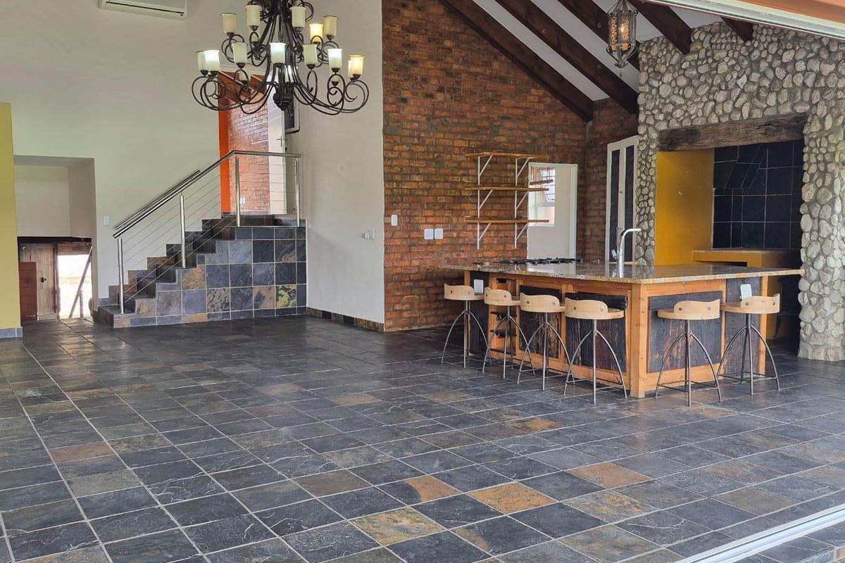 Enter through grand double wooden doors into a welcoming entrance hall that flows into a spacious open-plan living area. Here, indoor and outdoor spaces unite harmoniously, with stacker doors opening onto a covered balcony. This balcony, complete with a built-in braai, offers stunning views of the surrounding farm landscape and majestic mountains.