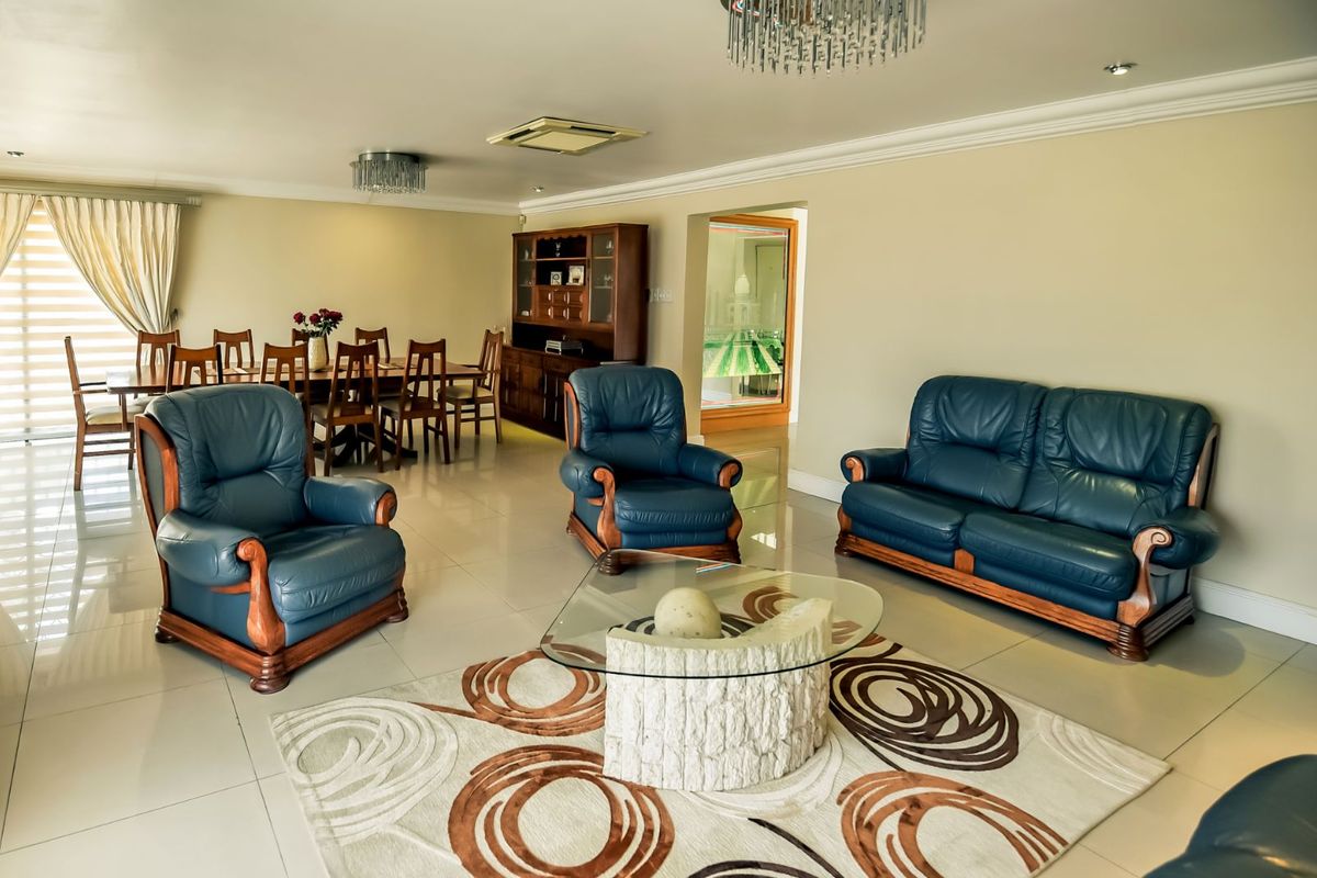 The house offers six bedrooms, of which 2 have en-suites. All the bedrooms have built-in cupboards finished in beech wood, embuia, and superwood, carpeted floors and air-conditioned for your comfort.