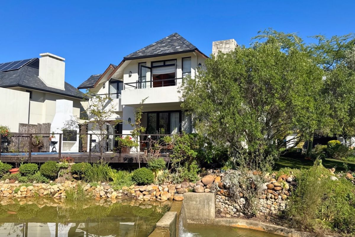 Lakeside living in Pearl Valley Golf Estate with Roodeberg mountain views — sunlit open-plan living, wood-burning fireplace, entertainment deck with pool and built-in braai. Three bedrooms, three baths.