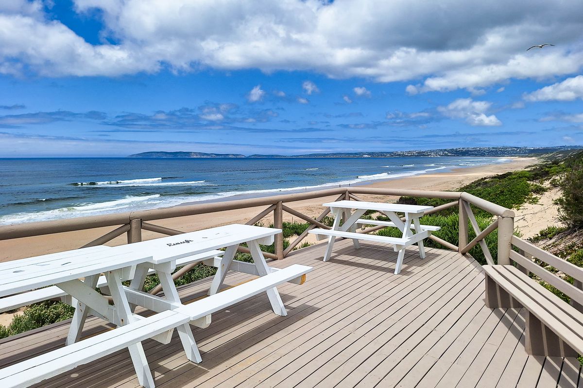 Relax to the waves in Keurboomstrand, steps from a Blue Flag beach; open-plan living onto an expansive patio with built-in braai and panoramic views — three bedrooms, two bathrooms.