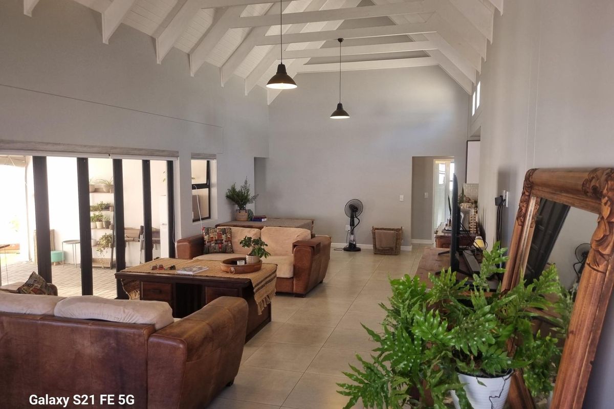 Relaxed coastal living in Jacobsbaai's secure estate, 900m from the beach and bordering a green belt. Private hot tub, open-plan flow — three beds, 2.5 baths, double garage.