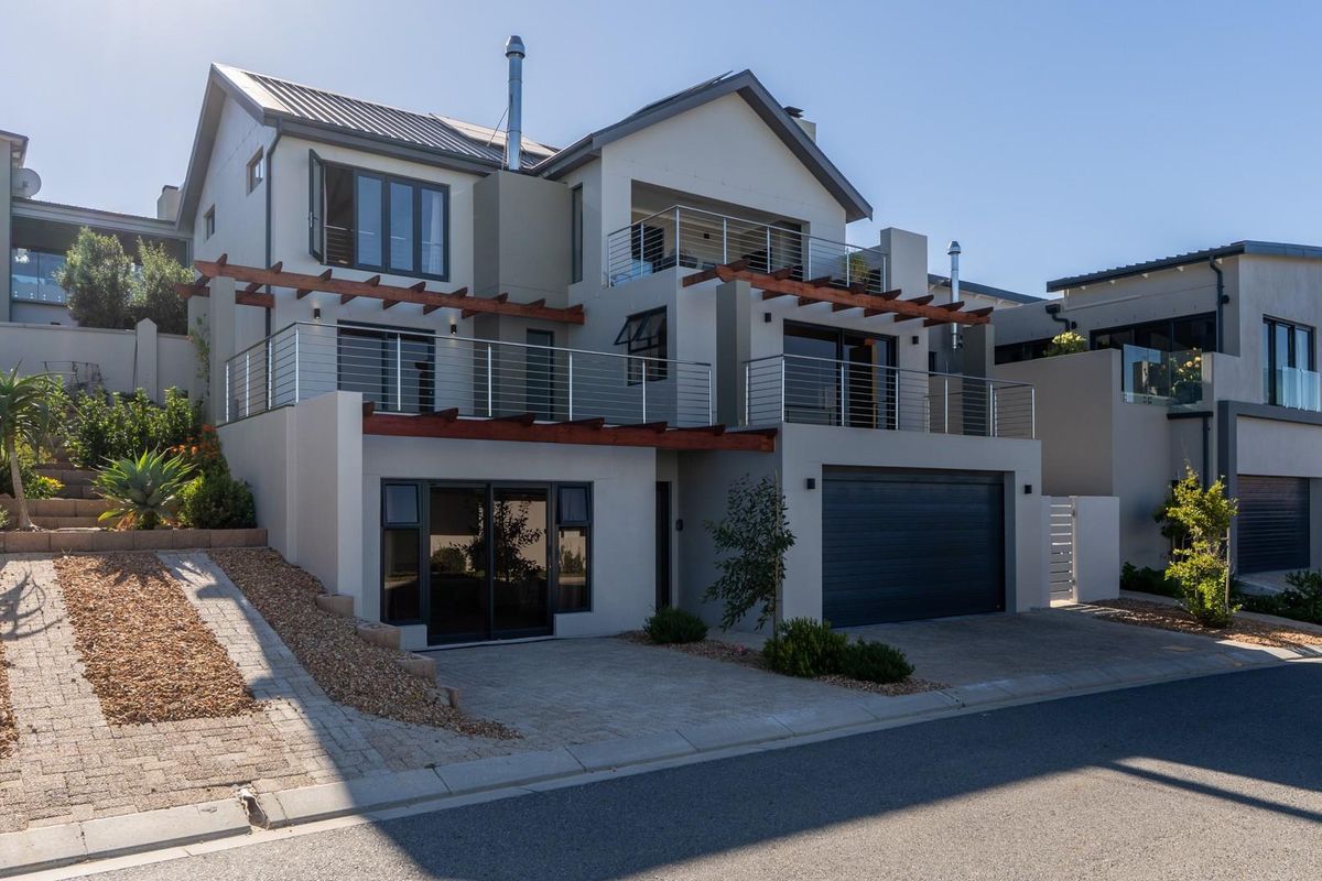 Entertainer's dream in Fairhaven Country Estate, offering sweeping False Bay and Hottentot Mountains views from an outdoor terrace with integrated smoker and braai; four en-suite bedrooms, modern open-plan kitchen.