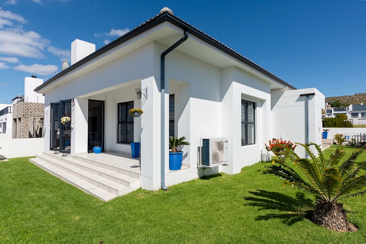 Seaside retreat in secure St Helena Bay Beach Estate, steps from the shore, with open-plan living, indoor braai and five-burner stove, solar geyser and double garage. 3-bed, 2-bath.