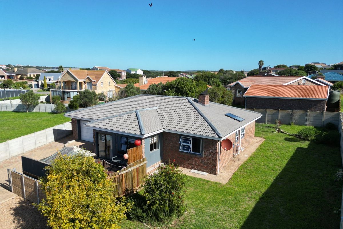 Relaxed Stilbaai West close living near shopping and business hubs, with open-plan kitchen island and large garden featuring built-in braai and entertainment area — three bedrooms, two bathrooms, double garage.