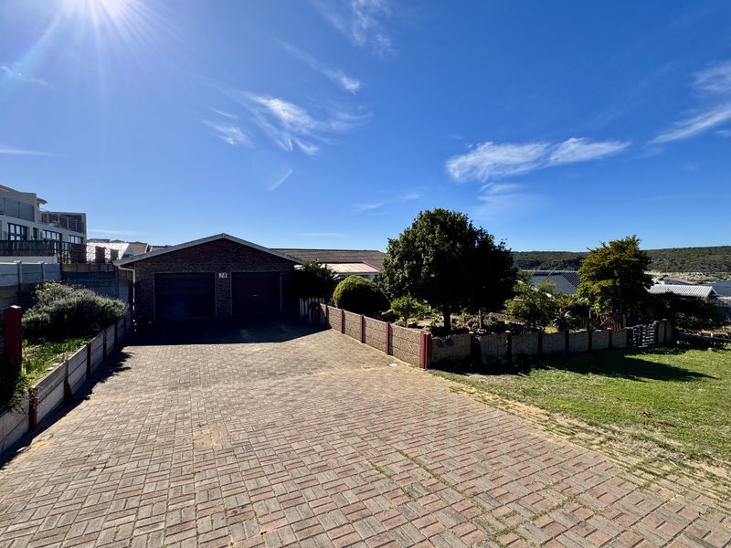 Stroll-to-river coastal living in Little England, Stilbaai — sunlit open-plan interiors with expansive backyard ideal for pool or entertaining; five bedrooms, two bathrooms and double parking.