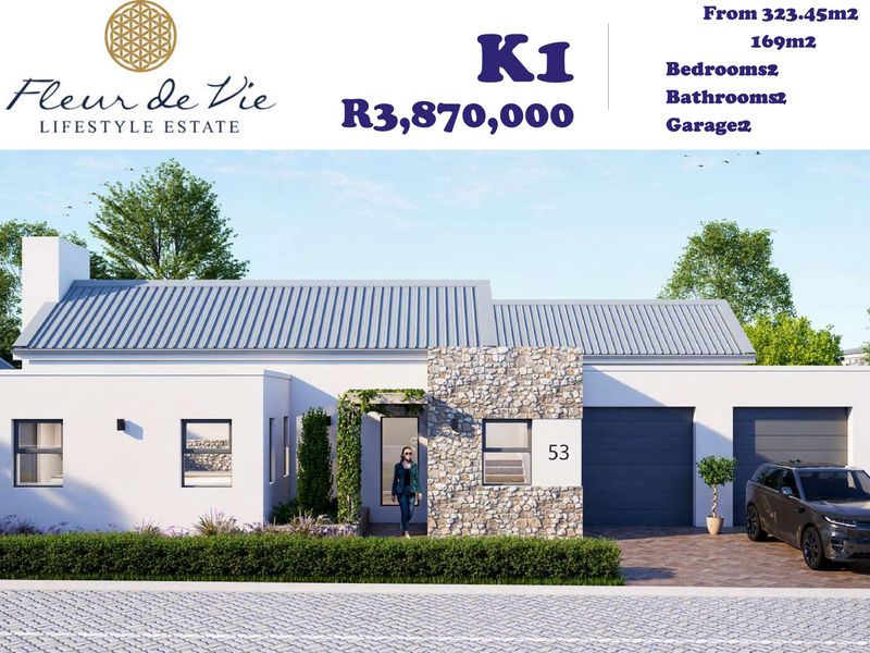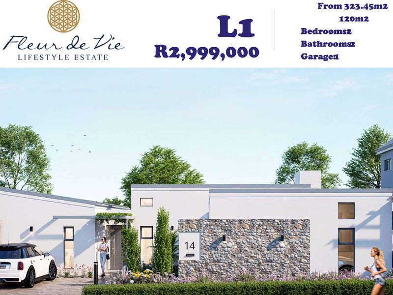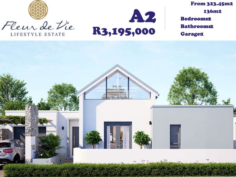 Effortless Garden Route living in Stilbaai's Fleur De Vie estate—secure, pet-friendly setting with open-plan living, built-in braai and private patio; includes study, two bedrooms, two bathrooms and double garage.