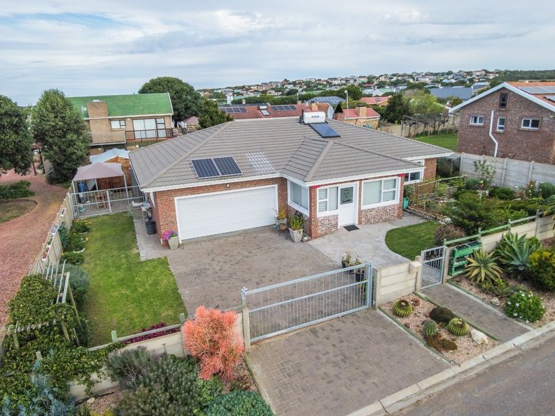 Wake up to coastal tranquility and sweeping hilltop views in Stilbaai; face-brick home with expansive manicured garden, built-in braai living area, five bedrooms and double garage.