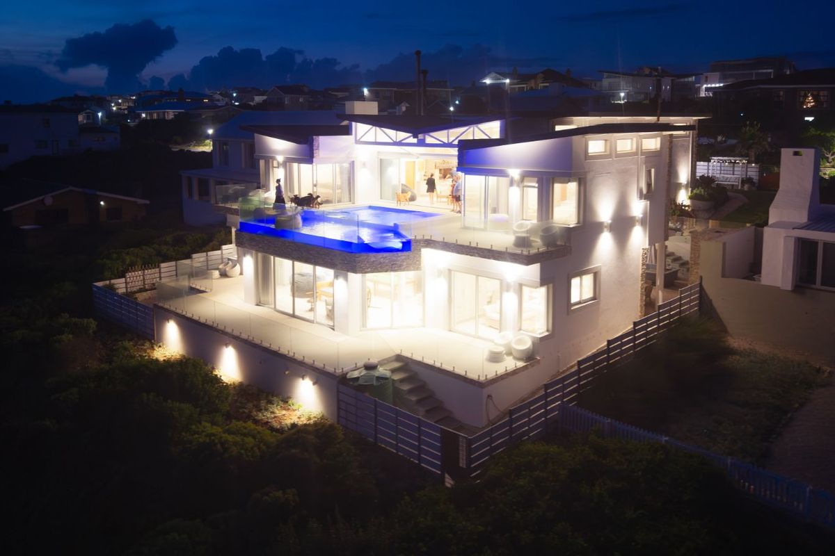 Oceanfront living on Ocean View Drive, Struisbaai — year-round entertaining with a heated infinity pool and integrated braai, chef’s kitchen, six en-suite bedrooms with private ocean patios.