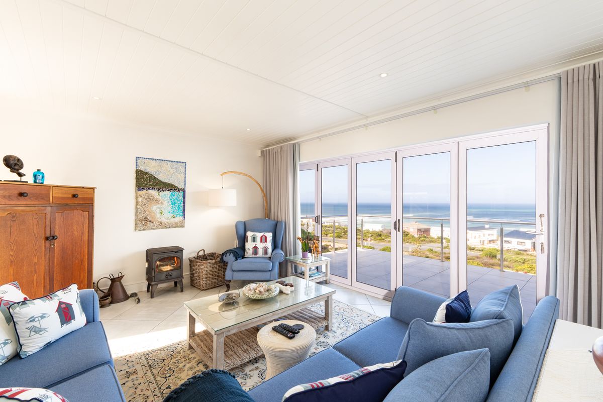 Elevated coastal living in Oceanview Heights, Struisbaai — panoramic Indian and Atlantic views, dual-living flat, modern Caesarstone kitchen, sheltered patio and outdoor fire pit near the beach.