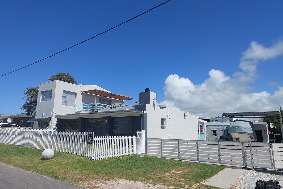 Coastal income-generating property steps from Struisbaai shops, harbour and beach, with three self-contained flats, private pool, enclosed braai stoep and a new boat canopy — five beds, five baths.