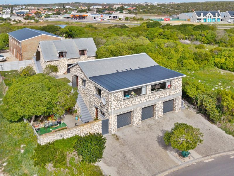 Coastal multi-income retreat in Argonauta Park, just 600m from Struisbaai swimming beach, featuring four independent units for rentals or family living, five beds, five baths, three covered parking.