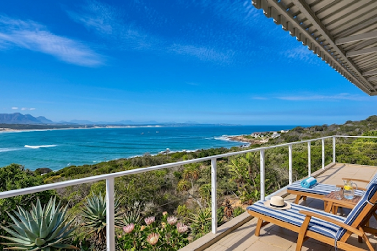 Coastal retreat in Karmosyn Estate, Vleesbaai — forest-like privacy and panoramic sea and mountain views, with wrap-around pool deck and separate granny flat; five bedrooms, double garage.