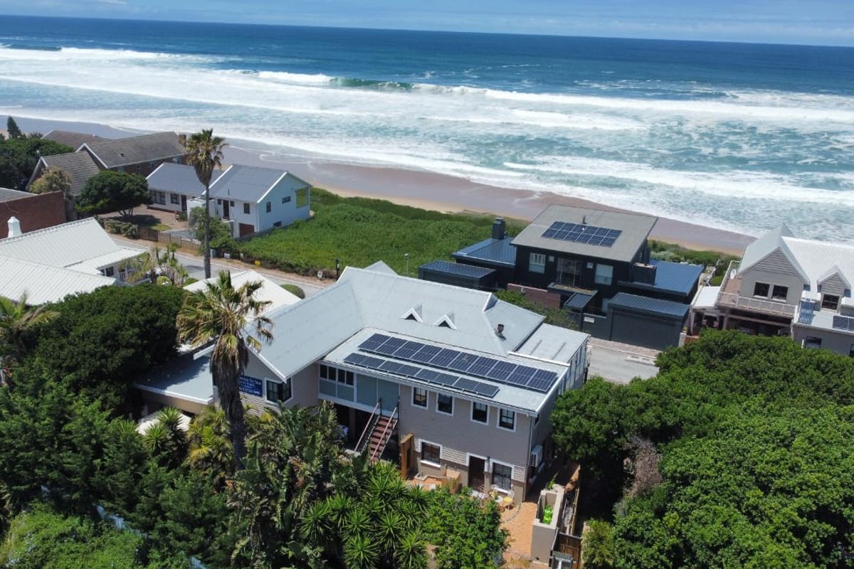 Beachside coastal living in Wilderness — watch whales from balconies in this solar-powered 10-bedroom, 10-bath guesthouse with a private 3-bedroom wing and courtyard veggie garden.