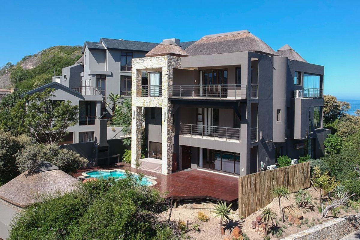 Coastal lifestyle in secure Wilderness Gardens Estate — entertain in an open-plan kitchen flowing to a balcony with panoramic ocean views, pool, wine cellar, four en-suite bedrooms and double garage.