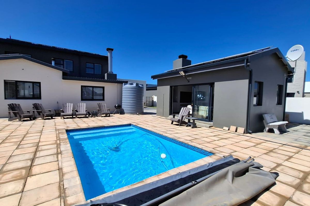 Embrace refined coastal living in Breedezicht Estate, Witsand — entertainers' home with an enclosed outdoor entertainment center and built-in braai; three bedrooms, 2.5 baths and four-car garage.