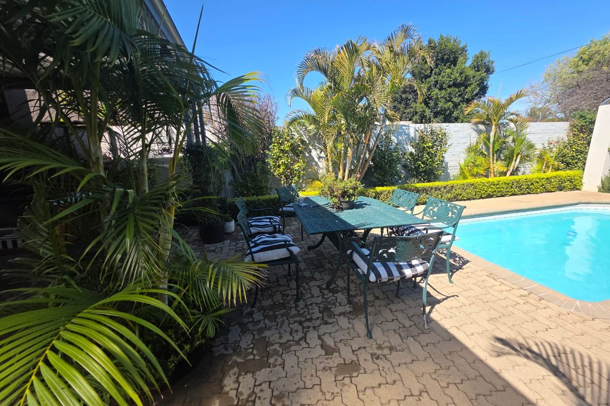 Outdoor living is a highlight, with two patios: one covered at the entrance and another spacious entertainment patio with a built-in braai. This larger patio comfortably accommodates a 8–10 seater table plus a lounge set, still leaving space to move around with ease. The property also includes a swimming pool, landscaped front and back gardens, a courtyard, paved areas, and an irrigation system.