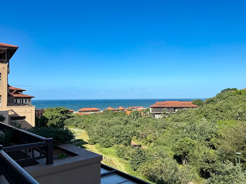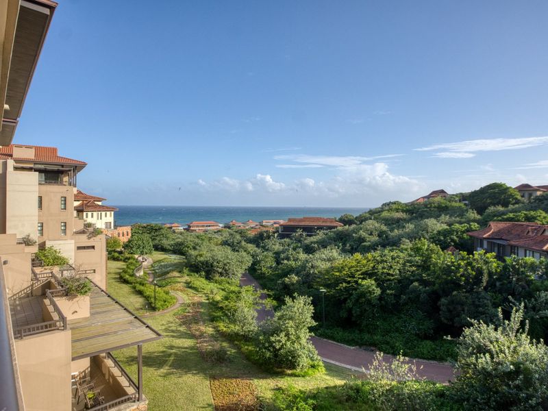 Resort-style apartment beside Zimbali Capital Hotel, offering open-plan kitchen and lounge flowing to a sea-view balcony, access to world-class amenities — one bedroom, en-suite bathroom and covered parking.