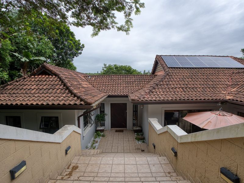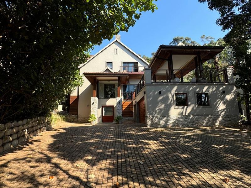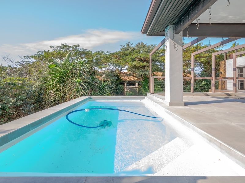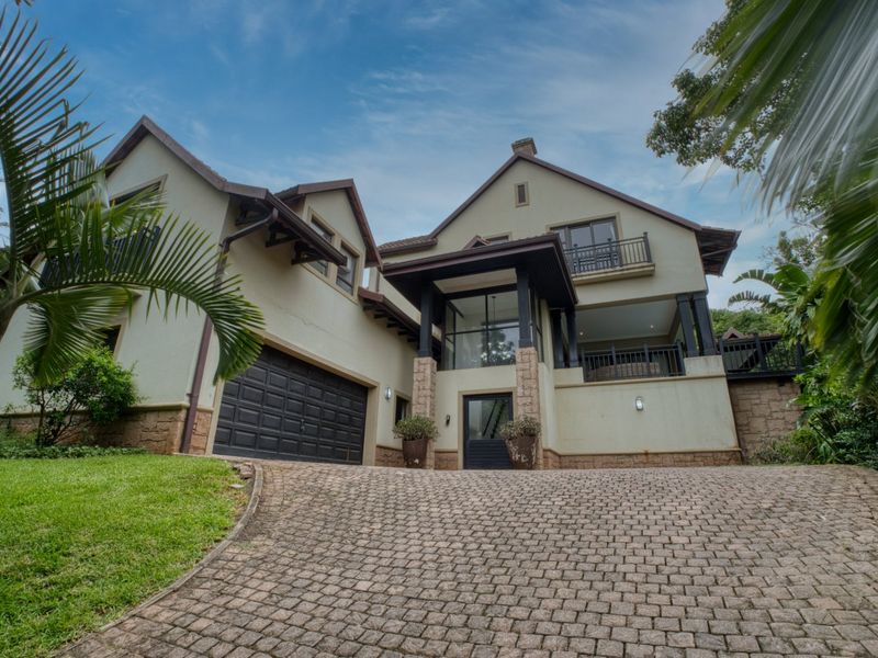 Secluded forest retreat in Zimbali Estate with double-volume entrance and seamless indoor–outdoor flow, private decks and entertainment area with built-in braai and splash pool; four en-suite bedrooms, double garage.