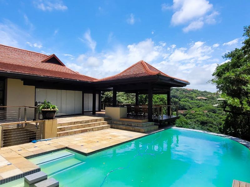 Entertain by the pool on a large patio in Zimbali Estate, with double-volume dining, sea-view main en suite, home office and access to golf, beaches and nature trails.