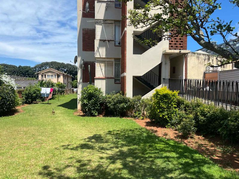 Peaceful ground-floor flat in Glenwood, perfect for retirees or small family, with private garden and easy walk to Glenwood Prep, Durban CBD nearby; one bedroom, one bath, open parking.