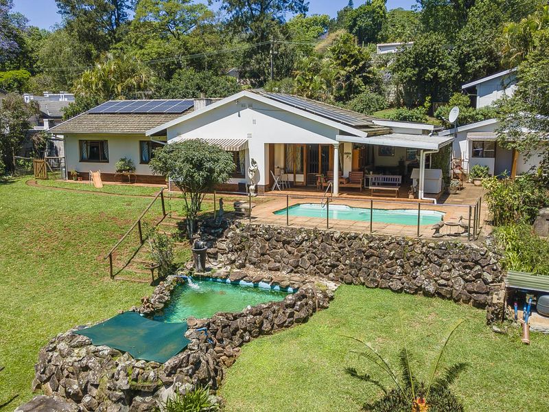 Relaxed family living in desirable Kloof with effortless indoor-outdoor flow, a covered pool and expansive 2,343 m² panhandle garden; private upstairs master balcony, three bedrooms and two bathrooms.