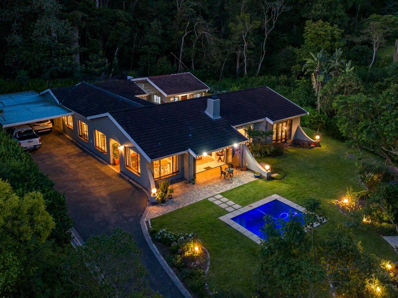 Lodge-style retreat in Maytime/Kloof Golf Course SRA, set among mist-belt gardens with a koi-pond entrance and timber interiors—three en-suite bedrooms, double garage, dual-living wing.