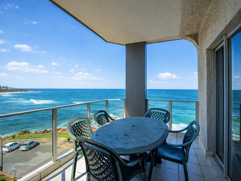 Wake up to ocean breezes and 180-degree sea views in Margate's Blue Flag beachfront — open-plan living flowing to a covered balcony, communal pool, double tandem garage.