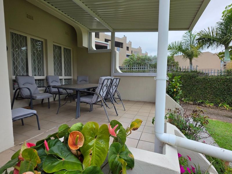 Sea-scented coastal living in Uvongo — ground-floor unit with garden access, secure complex and a dedicated parking bay; comfortable open lounge with two bedrooms and two bathrooms.
