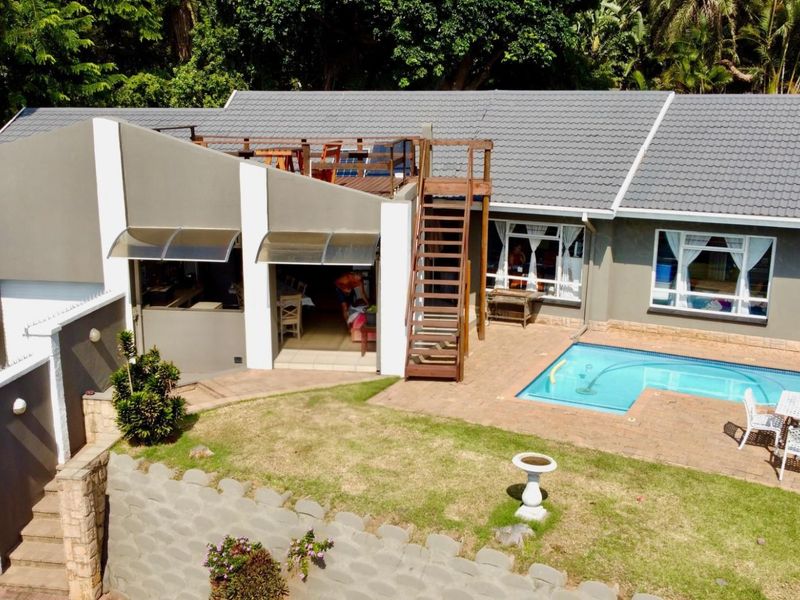 Coastal family living in Uvongo, Margate — expansive 1,650m² garden with a separate flatlet and balcony for guests; five bedrooms, three bathrooms and two single garages.