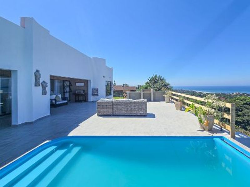 Coastal family entertainer offering sunlit open-plan living, poolside balcony with built-in braai and sweeping sea views, mature garden and a modern kitchen—five bedrooms, three baths, double garage.
