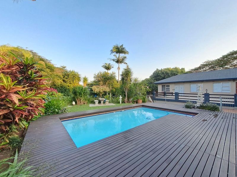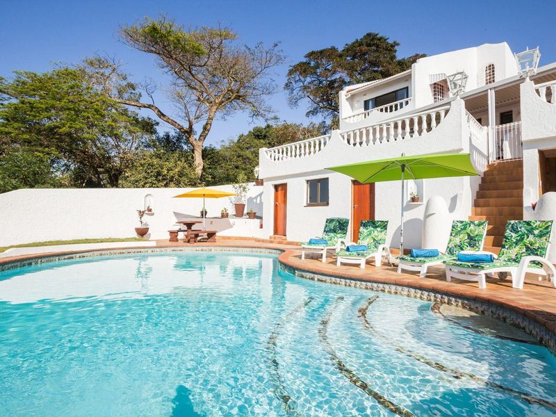 Seaside village entertainer's retreat in Mtunzini with sea views, expansive balcony overlooking pool, fully fitted kitchen and income-generating one-bedroom flat; five-bedroom main house, two garages and carport.