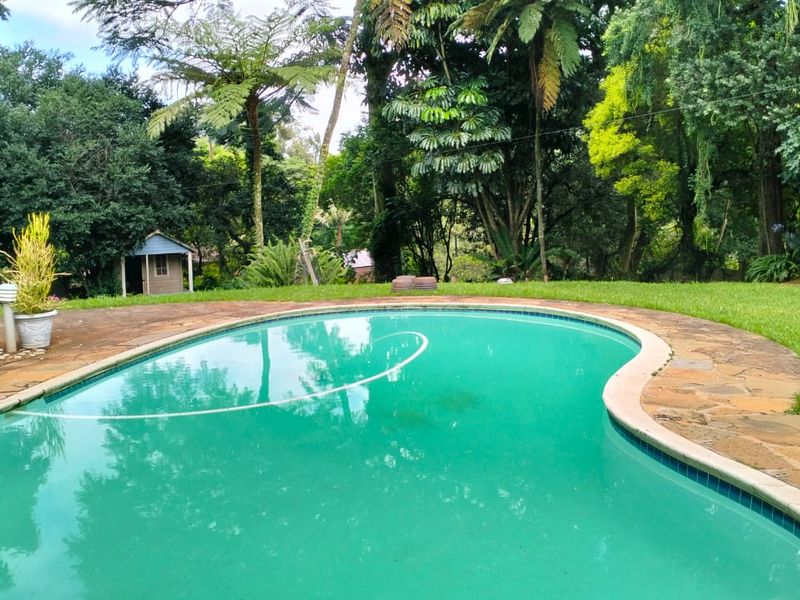 Relaxed suburban living in Pietermaritzburg, surrounded by mature trees and nature — enjoy a backyard oasis with a sparkling pool and open-plan kitchen. Four bedrooms, two baths.