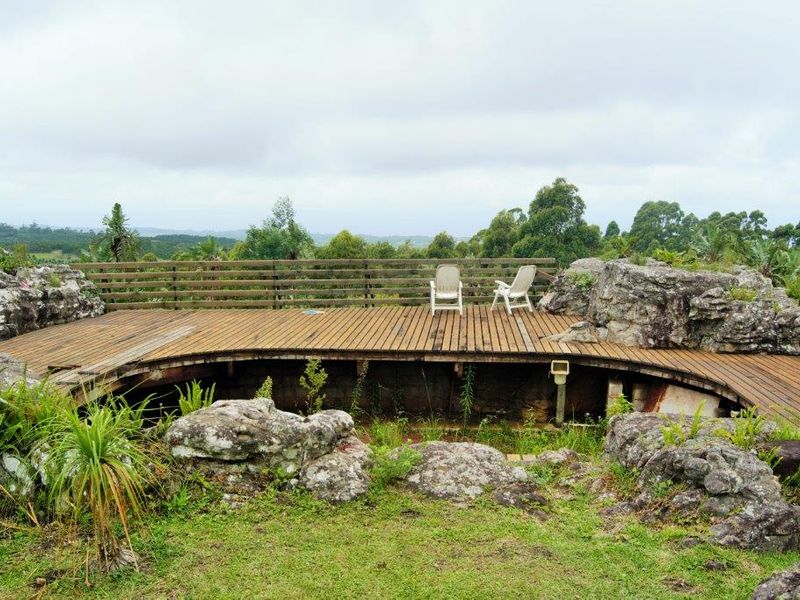 Country-coastal living on a macadamia farm with dramatic sea views; home built into natural rock outcrops and a glass-enclosed braai room. 4-bed main, plus 3-bed cottage.
