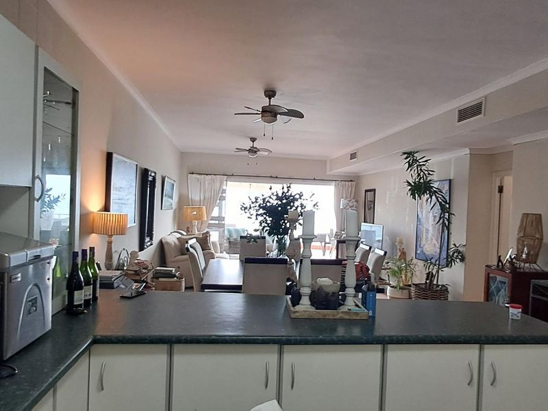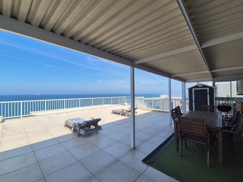 Beachfront penthouse opposite Umdloti tidal pool, generating R450–500k/year as a vacation rental; renovated, fully furnished with 3 beds, 2 baths and enormous 180° balcony.