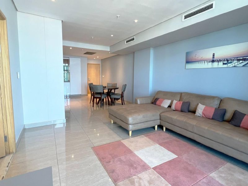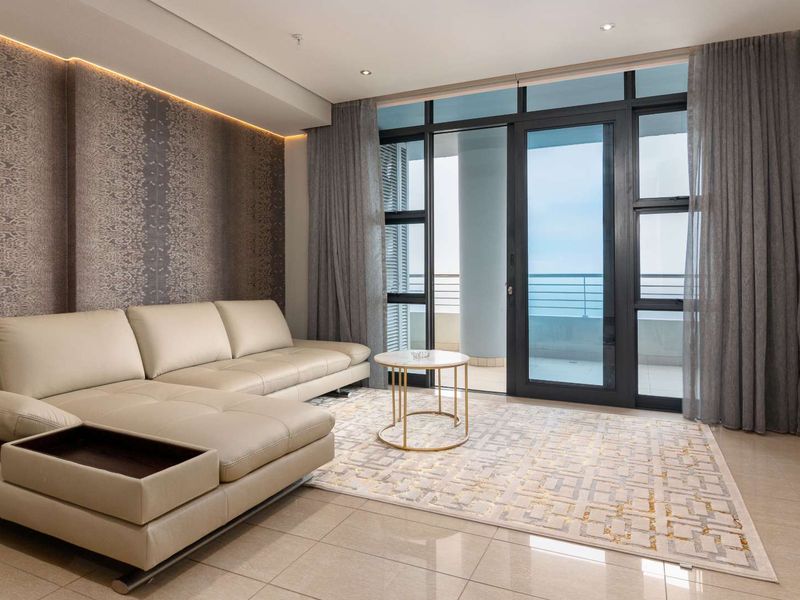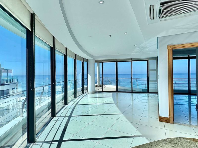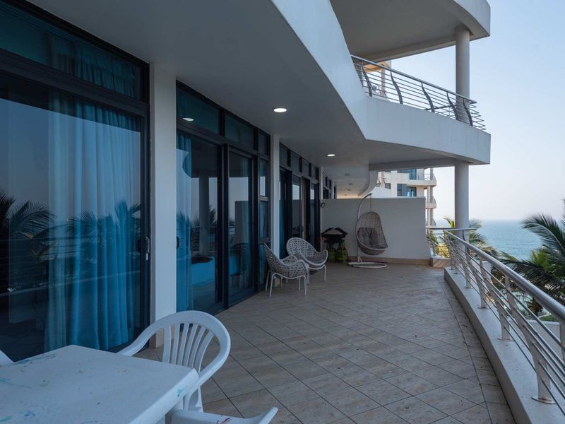Resort-style coastal living in Umhlanga, steps from Pearls Mall and the promenade, with a sprawling 35m² balcony offering sweeping ocean views; fully furnished, three en-suite bedrooms, two covered parking